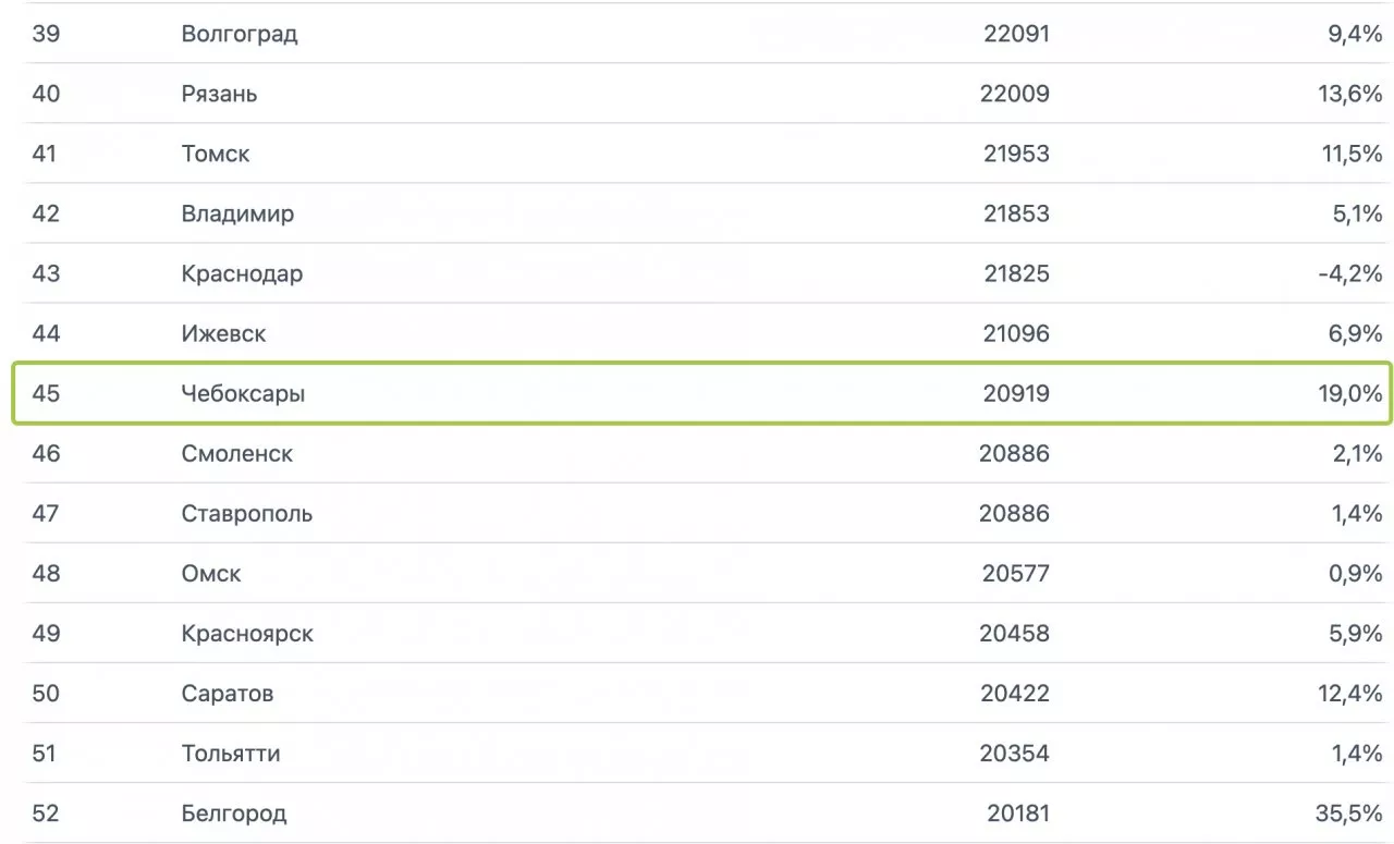 Больше всего выросли в цене объекты в Белгороде (+35,5 %) и Курске (+24,9 %). Также существенный рост зафиксирован в Чебоксарах (+19 %) и Барнауле (+17,2 %). Средняя стоимость аренды таких квартир в России составляет 23 868 рублей в месяц. В целом с начала года аренда маленьких квартир в стране подорожала на 3,7 %.
