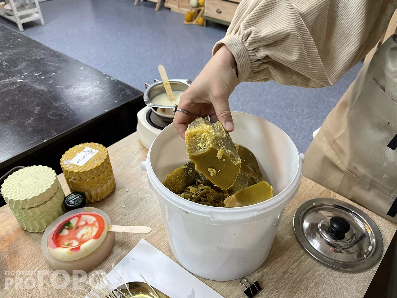 Следующий этап в создании свечей на основе советских украшений – подготовка материала для свечей. Для этого используется обычный свечной воск, который можно найти на маркетплейсах. Впрочем, часть воска в мастерской Оксаны приехала из ее родной деревни: