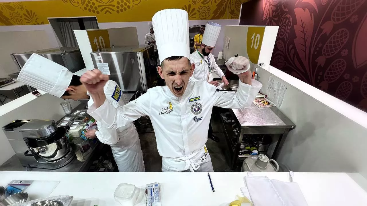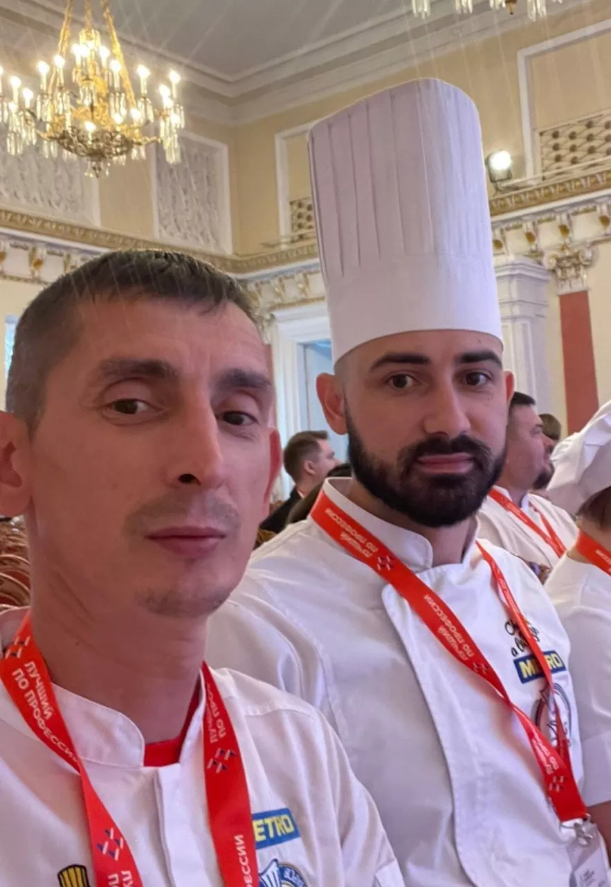 «Закуска состояла из суфле судака с форелью в двух текстурах, рулета из судака с овощами и гедзе (японские пельмени. – Прим. ред.) из савойской капусты. На горячее мы приготовили говяжий рулет также в двух текстурах, хрустящий крокет (шарики или овальные цилиндры. – Прим. ред.) с грибной начинкой и гречотто (гречневая крупа, приготовленная по технологии итальянского ризотто. – Прим. ред.) с овощами. А на десерт у нас был брусничный малиновый мусс, панна-котта из творога с ягодным тартаром и рафаэлло из заварного крема с фундуком. Почему такие блюда? Потому что, согласно конкурсному заданию, в холодной закуске обязательными продуктами были: судак, картофель и огурец; в горячем: говяжья вырезка, гречка и лук; в десерте: брусника, творог и фундук. И исходя из этих продуктов, мы придумывали новые блюда. Чтобы блюдо получилось вкусным, необходимо знать, какой компонент с каким лучше сочетается, и уже от этого отталкиваться. В чемпионате важно постоянно следить за процессом приготовления: отошел на минутку – и блюдо может быть испорчено», – рассказывает капитан команды, шеф-повар Александр Гониашвили.