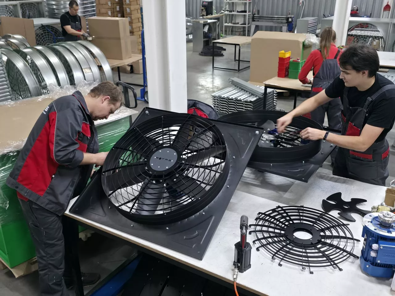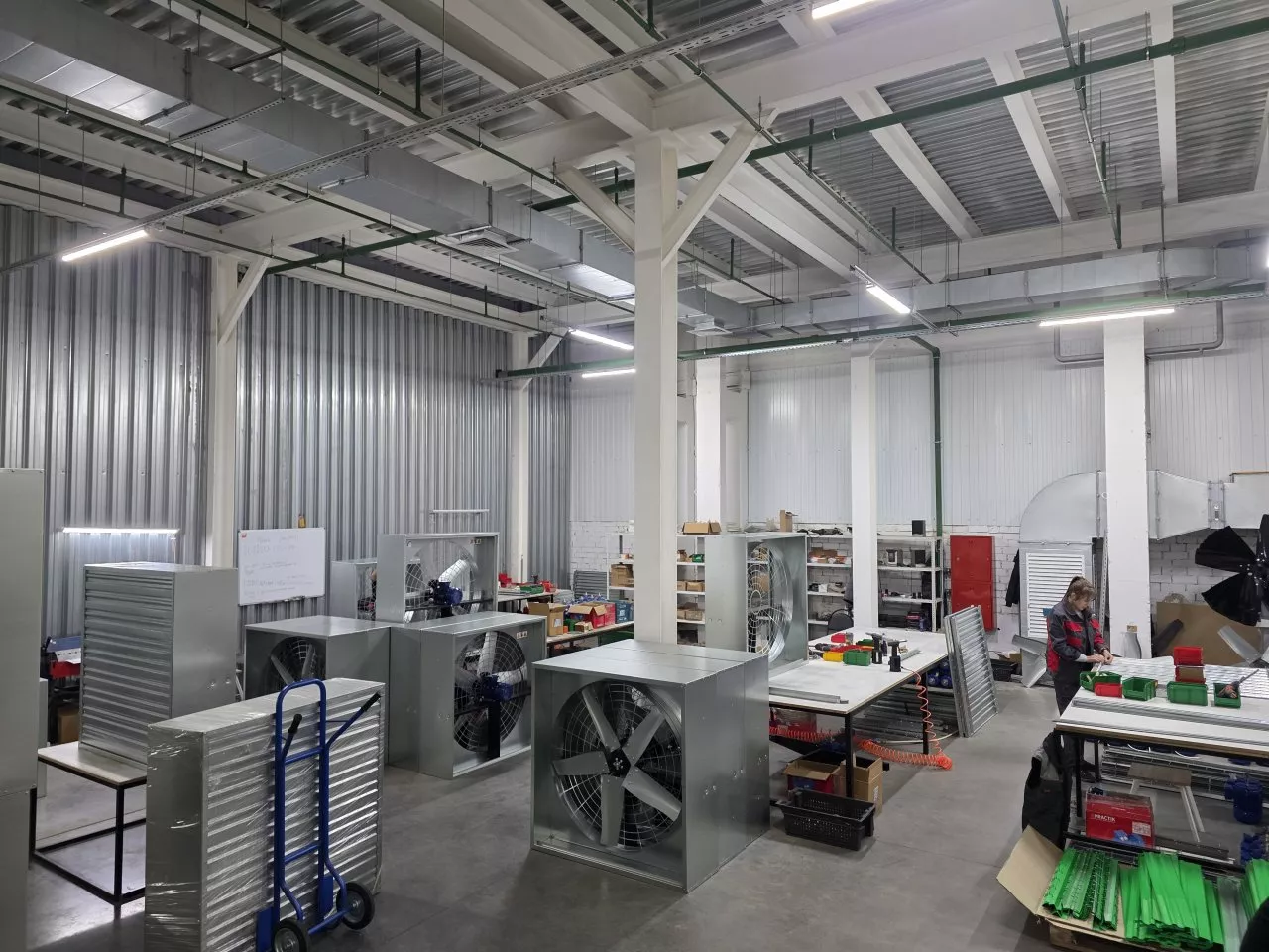 Сегодня производство занимает 1700 кв. метров. Именно здесь создаются промышленные вентиляторы для производственных цехов, ангаров, складов, центров обработки данных, агропромышленных объектов (зернохранилища, теплицы, овощехранилища, животноводческие фермы и другие). У каждого продукта свое назначение – циркуляция воздуха, охлаждение оборудования, поддержание климата.