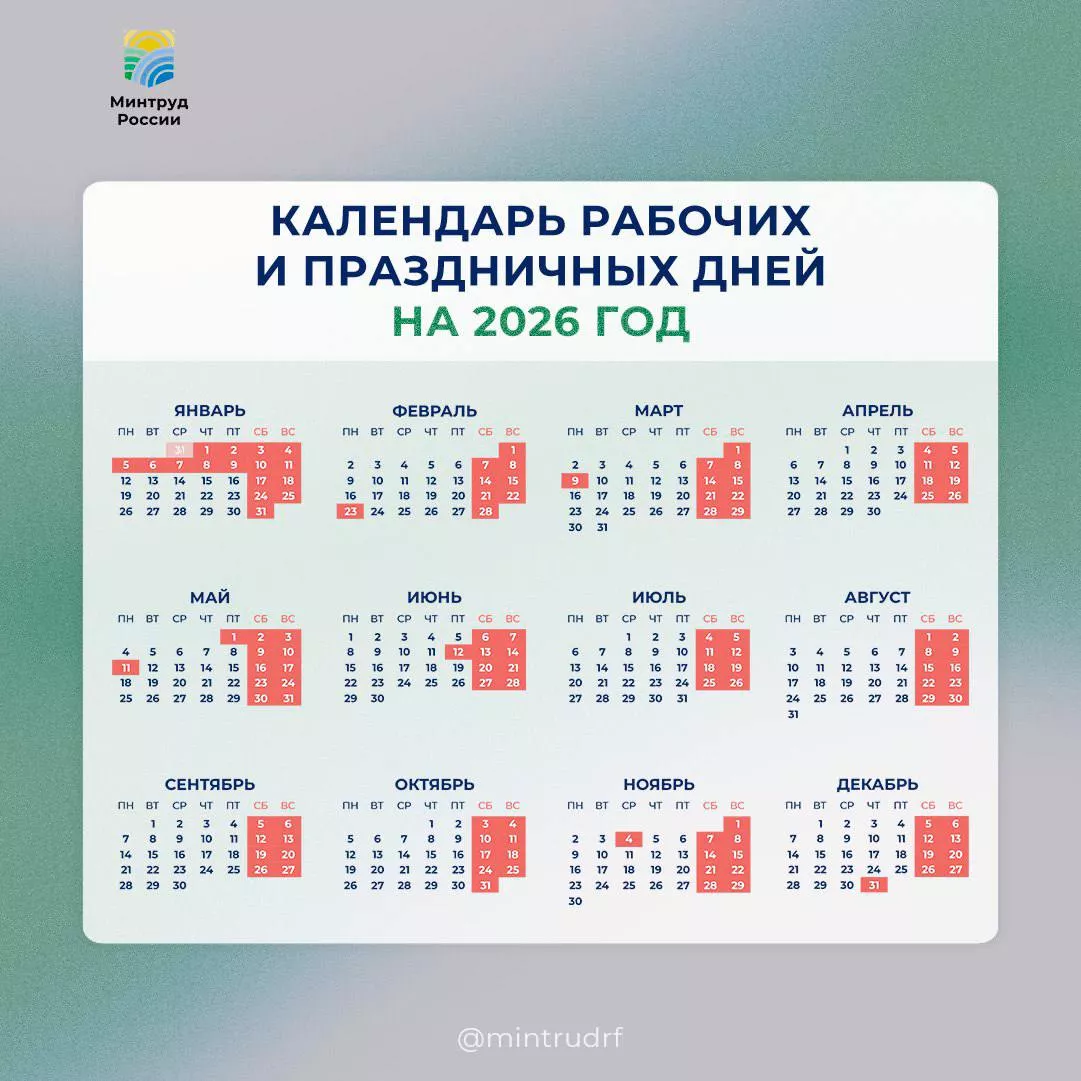 Дополнительные выходные в 2026 году выпадут на 4 ноября и 31 декабря. В ноябре из-за праздника рабочая неделя распадется на два коротких отрезка. В последнюю декабрьскую неделю потребуется выйти на работу только три дня. Для тех, кто работает по стандартному графику с двумя выходными, общее число нерабочих дней составит 118, а рабочих – 247.