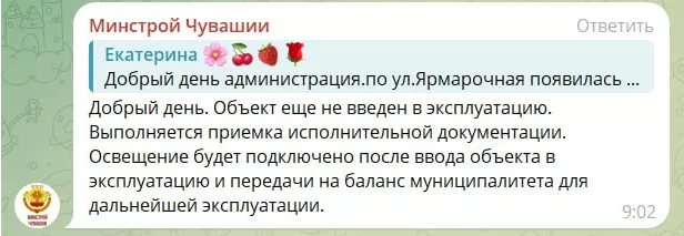 "Объект еще не введен в эксплуатацию. Выполняется приемка исполнительной документации. Освещение будет подключено после ввода объекта в эксплуатацию и передачи на баланс муниципалитета", – сообщили в министерстве.