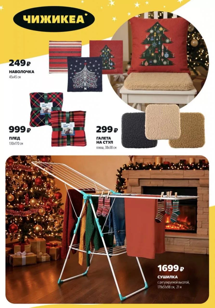 По текстилю «Чижик» тоже сделал ставку на узнаваемые новогодние мотивы в стиле Икеа — клетку, елки и минималистичные принты. Наволочки 45×45 см с рисунками елок и зимних сюжетов предлагаются по 249 рублей, и этого уже достаточно, чтобы обычный диван превратить в «зимний уголок»: можно просто надеть их на свои подушки‑вкладыши. Плед размером 130×170 см в красно‑зеленую клетку обойдется в 999 рублей, он достаточно плотный, чтобы накрыть им кресло или использовать как покрывало на половину дивана — такой прием часто используют именно в скандинавских интерьерах. Для кухонных и обеденных стульев есть мягкие «галеты» на сиденье из плюша 38×38 см по 299 рублей, и это редкий вариант, когда за небольшие деньги можно сразу обновить обеденную зону и добавить ей уюта.