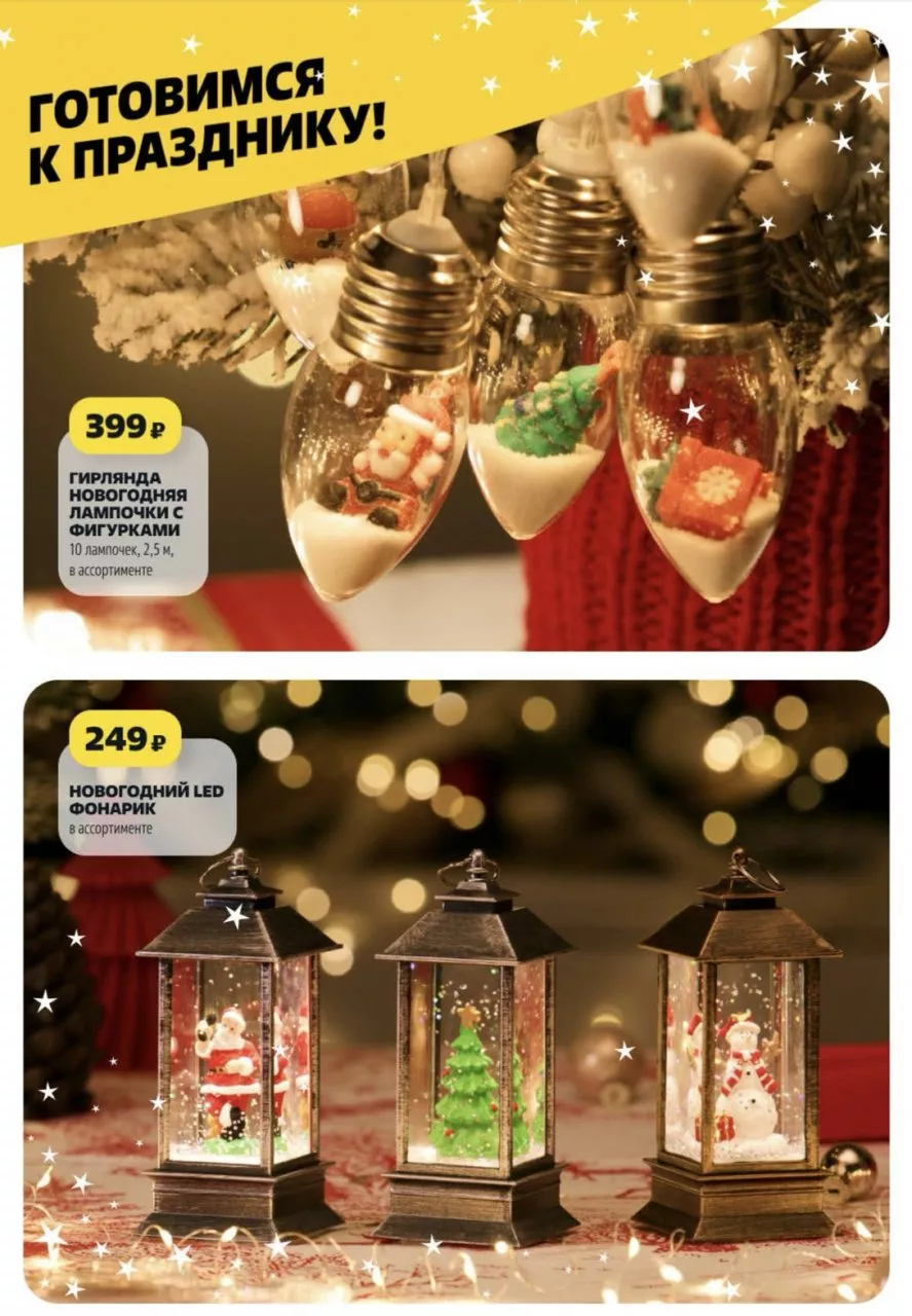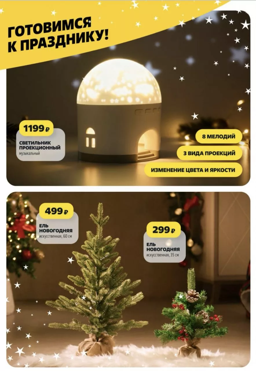 Если нужен сильный вау‑эффект при минимуме усилий, пригодятся светильники и настольный декор. Музыкальный проекционный светильник за 1199 рублей не только подсвечивает комнату теплым светом, но и рисует на стенах узоры, а еще у него восемь мелодий, три вида проекции и регулировка цвета и яркости — функционал, который обычно встречается у устройств из более высокой ценовой категории. За 299 рублей можно взять компактную LED‑лампу‑ночник с маркером: на прозрачном диске с контуром елки рисуешь свои узоры, стираешь и переделываешь — такой вариант особенно подходит для детской, потому что ребенок сам участвует в оформлении комнаты. Атмосферу европейских рождественских витрин создают новогодние LED‑фонарики за 249 рублей: внутри мини‑фонаря — фигурки Деда Мороза, елки или снеговика, а когда включаешь подсветку, они напоминают маленькие снежные шары. Похожее настроение дают гирлянды‑лампочки с фигурками по 399 рублей за 2,5‑метровую нить с десятью колбами: внутри каждой мини‑игрушка на снегу, и такая гирлянда смотрится дороже своей цены.