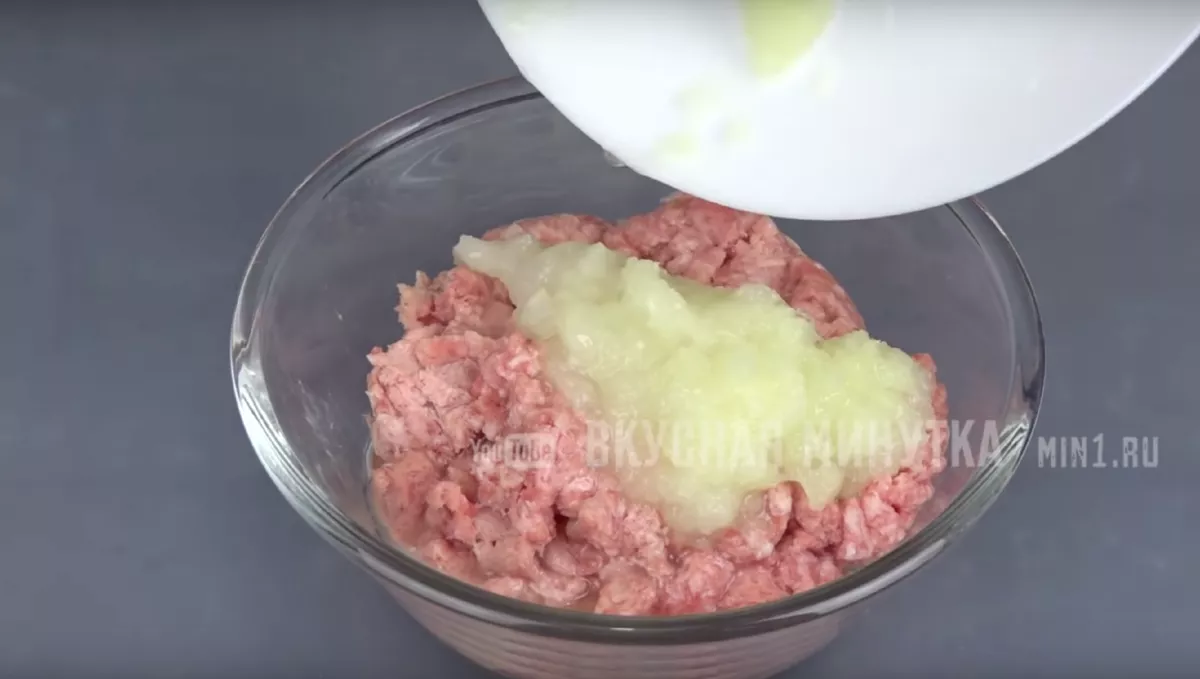 Сначала готовлю начинку. Беру любое мясо, чаще всего свинину или индейку. Лук натираю на мелкой терке и отправляю к фаршу, добавляю соль, черный перец и немного очень холодной воды, чтобы начинка получилась более сочной, и хорошо вымешиваю до однородности.
