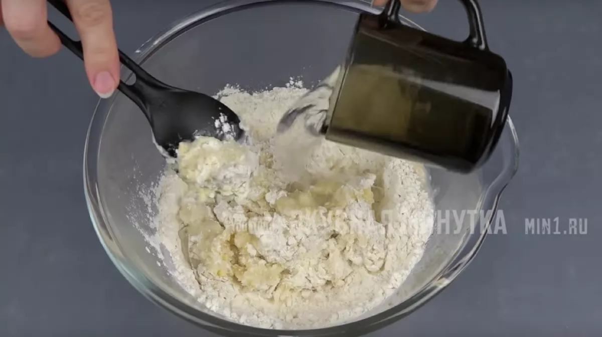 Потом перехожу к тесту, в последнее время делаю только заварное, с ним удобно работать, оно мягкое и вкусное. В просеянную муку добавляю яйцо, соль и немного растительного масла, перемешиваю вилкой, чтобы яйцо распределилось по муке. Затем вливаю крутой кипяток, сначала вымешиваю ложкой, а когда масса немного остывает, домешиваю руками, получается эластичное, податливое тесто.