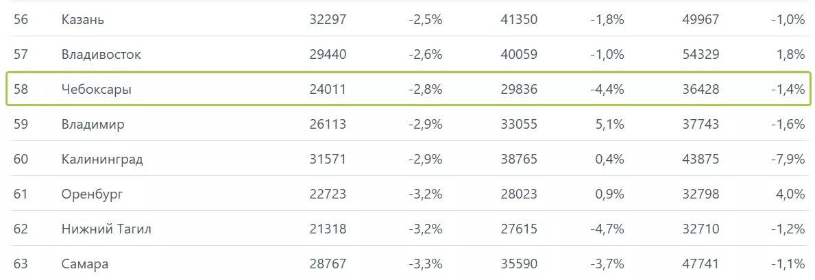 В Чебоксарах цены на съемное жилье снизились по всем категориям квартир. Однокомнатные подешевели на 2,8 % и теперь стоят 24 011 рублей в месяц. Двухкомнатные упали сильнее – на 4,4 %, до 29 836 рублей. Трехкомнатные квартиры потеряли в цене 1,4 % и сдаются за 36 428 рублей в месяц.