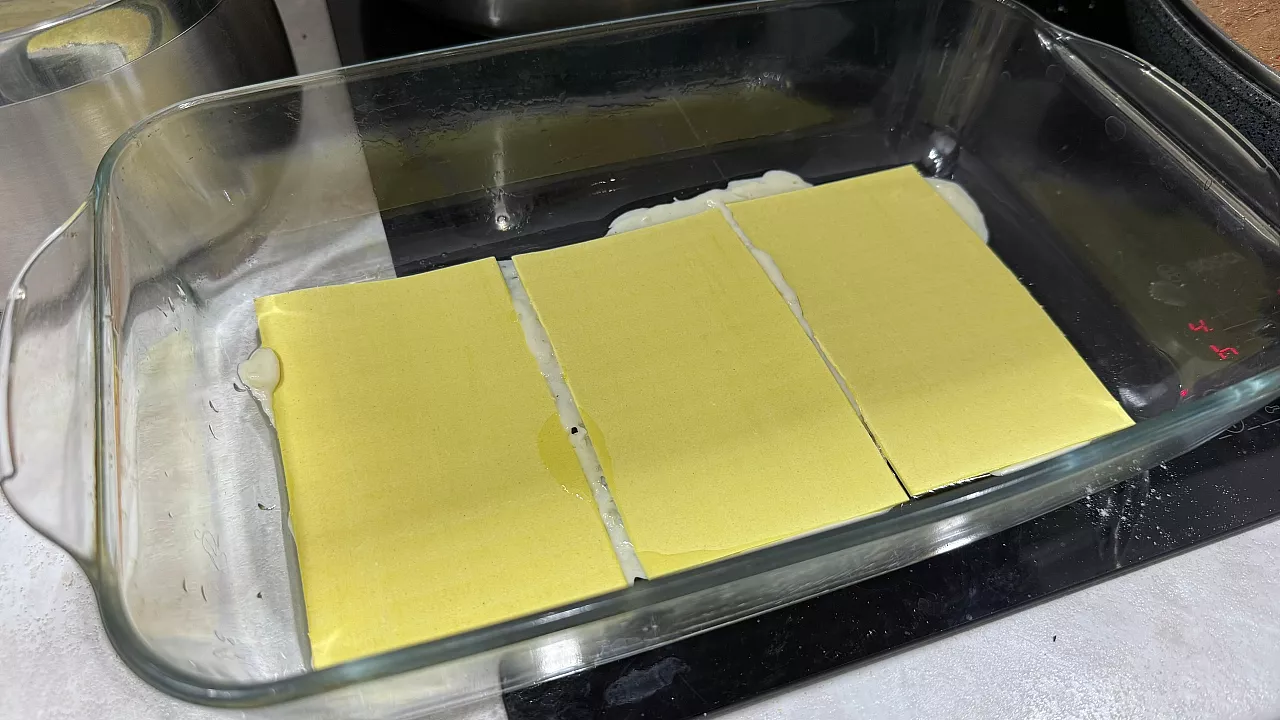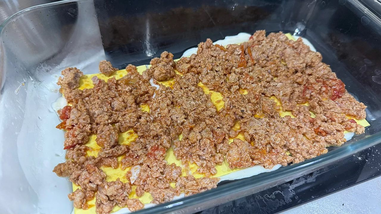 Форму смазывают маслом, выкладывают слой соуса мясного, накрывают листами лазаньи, затем бешамель и слой тертого сыра — и так до верха. Верхний слой должен быть из бешамеля и сыра — именно он создаст золотую, тянущуюся корочку. Выпекают при 180 °C около 40 минут, пока лазанья не станет румяной и не начнёт пузыриться по краям.