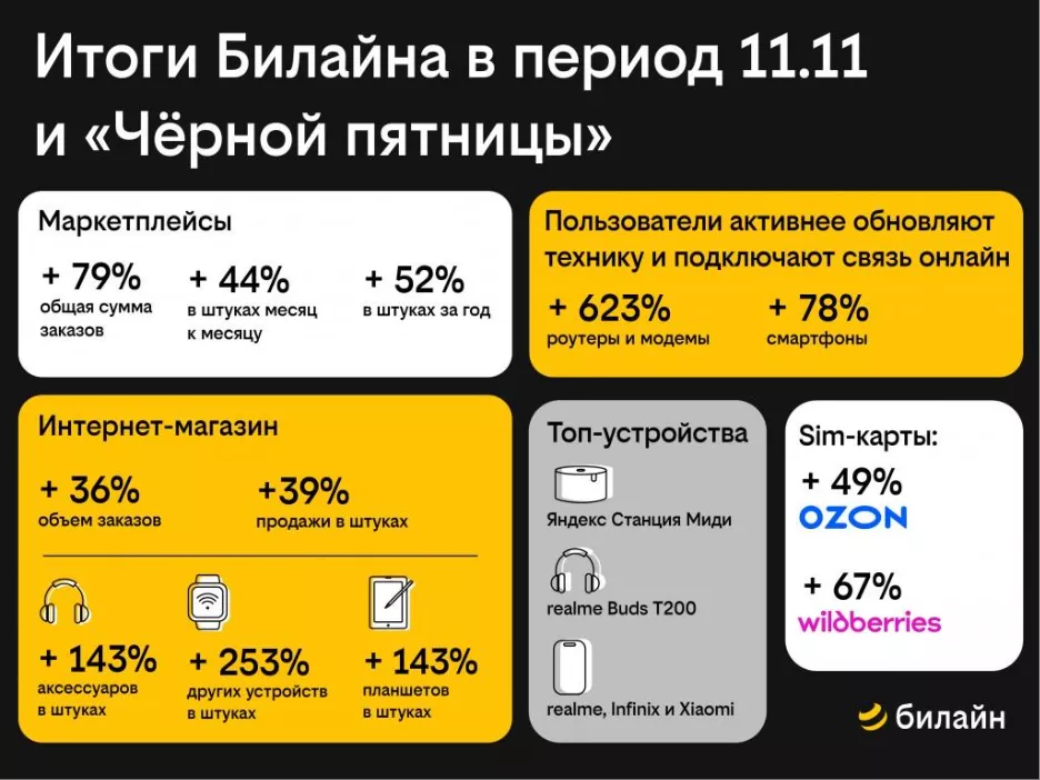 Дополнительный рост спроса Билайн зафиксировал и в собственном интернет-магазине в период распродаж 11.11 и «Чёрной пятницы». По сравнению с доакционным периодом объём заказов увеличился на 36%, а продажи в штуках — на 39%. Продажи аксессуаров выросли на 143% в штуках и на 139% по выручке, а других устройств — на 253% в штуках и на 142% по выручке. Продажи планшетов увеличились на 143% в штуках и на 34% по выручке. Подобная динамика отражает не только растущий интерес клиентов к технике в период сезонных распродаж, но и их выбор в пользу проверенных площадок, таких как интернет-магазин Билайна.
