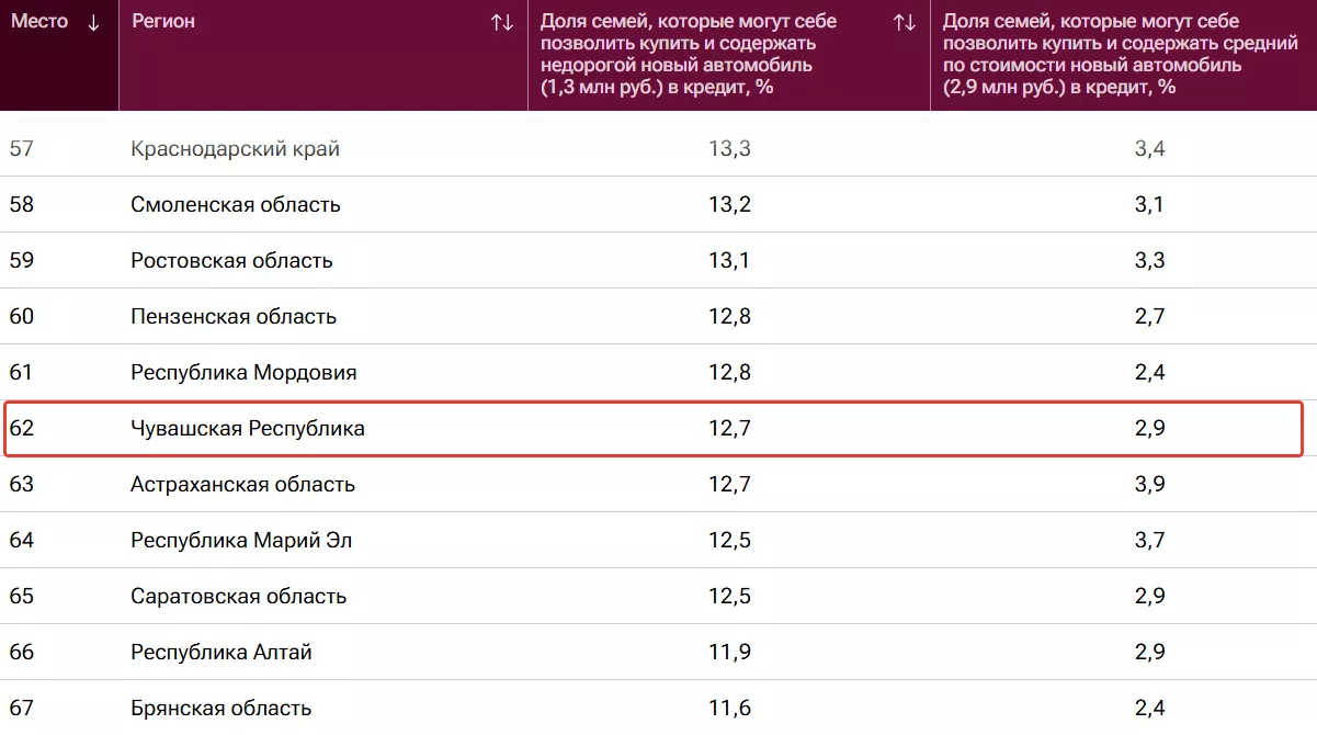 В Чувашии доля семей, которые могут себе позволить купить и содержать недорогой автомобиль со средней стоимостью 1,3 млн рублей в кредит, составляет 12,7 %. Владеть более дорогим автомобилем, который в среднем стоит около 3 млн, доступно всего 2,9 % семей.