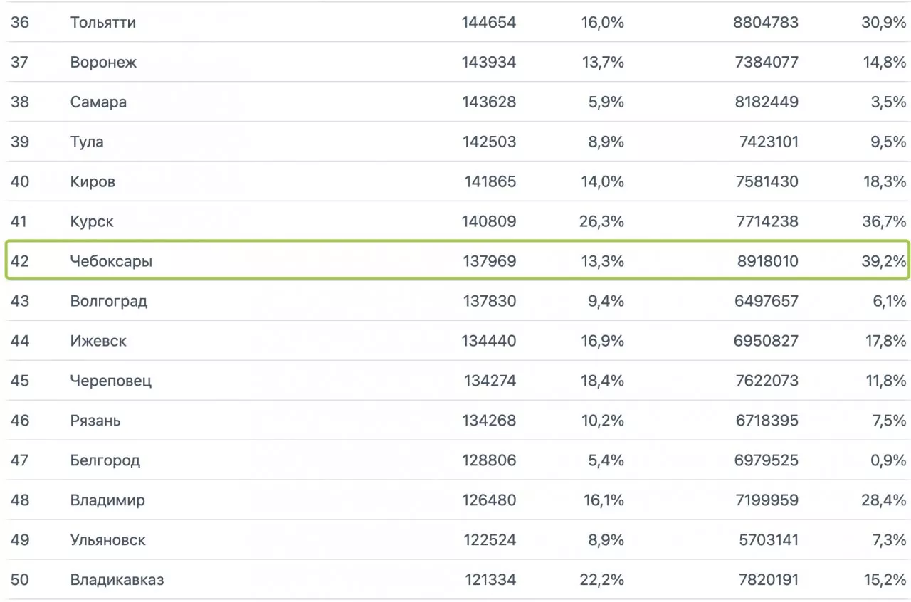 Как сообщает портал "Мир квартир", после Чебоксар самый сильный рост цен на квартиры показали Магнитогорск (+37,1 %), Курск (+36,7 %) и Тольятти (+30,9 %). Что касается квадратного метра, то сильнее всего он подорожал в Грозном (+34,9 %), Магнитогорске (+32,5 %) и Курске (+26,3 %).