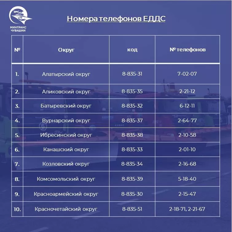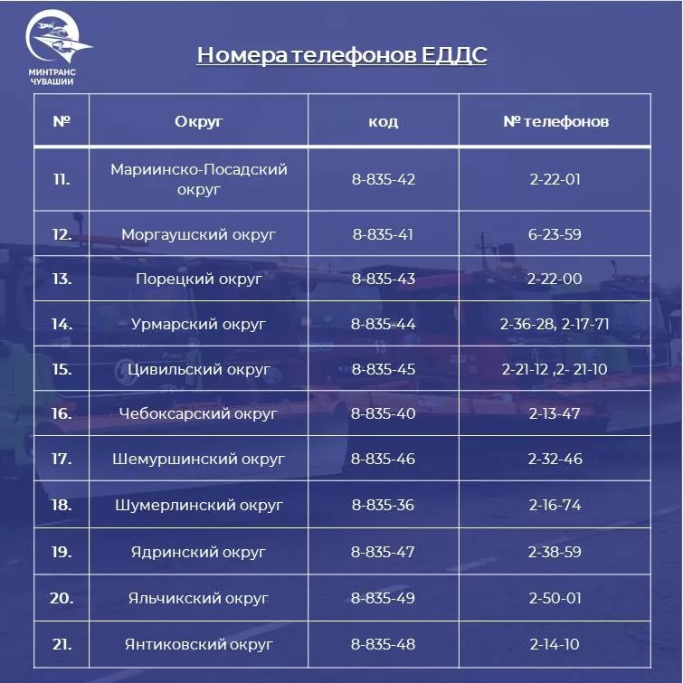 Полный список номеров телефонов единых дежурно-диспетчерских служб районов республики публикует Минтранс Чувашии: