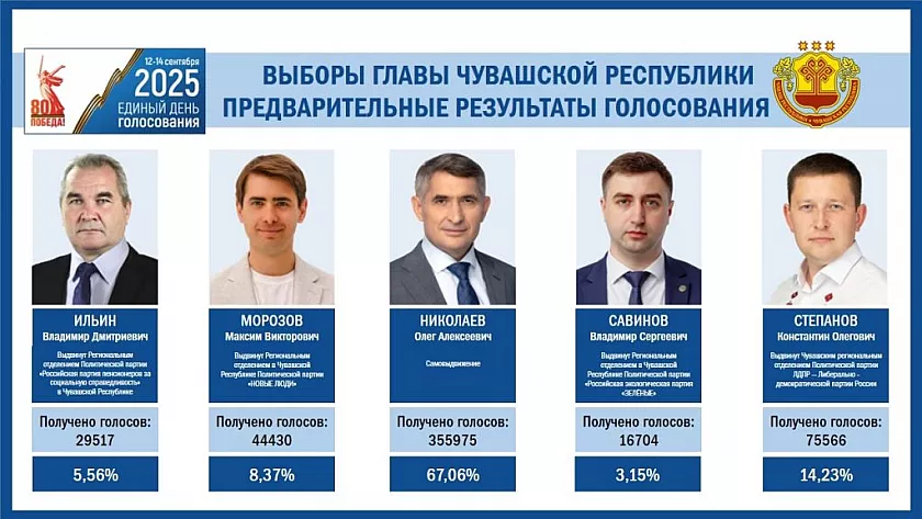 Самым крупным политическим событием начала осени стали выборы главы Чувашии. Они прошли с 12 по 14 сентября. Сюрпризом их результат не стал – уверенную победу одержал действующий глава Олег Николаев, набравший 67,06 % голосов. Вторым на выборах стал представитель ЛДПР Константин Степанов (14,23 %), а на третьей позиции оказался кандидат от партии "Новые люди" Максим Морозов (8,37 %).