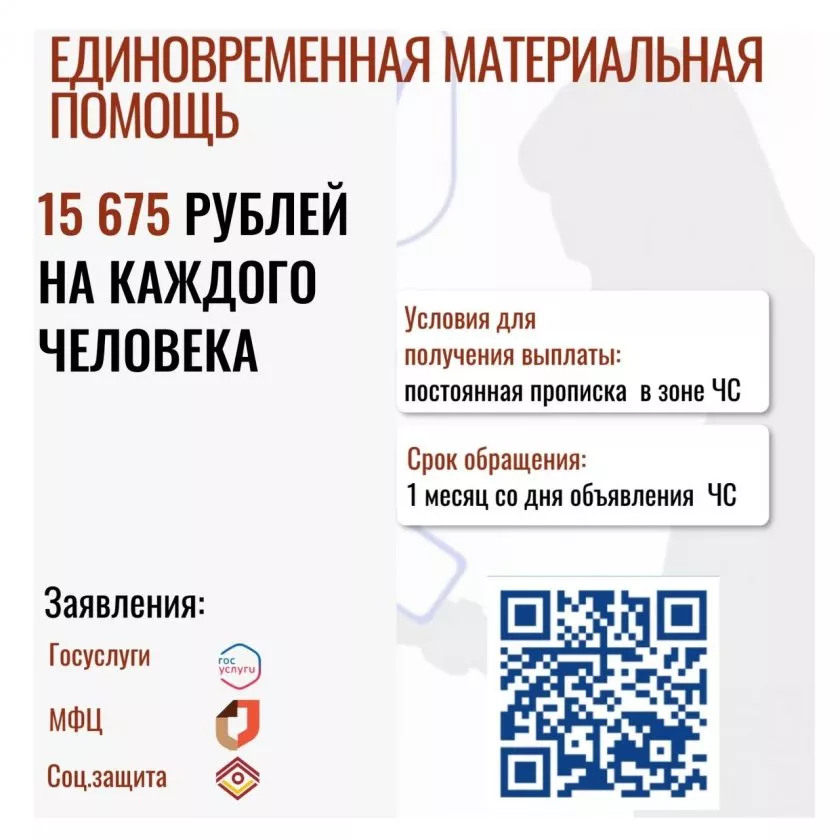 - Материальная помощь для имеющих постоянную прописку в зоне ЧС – 15 675 рублей на человека.
