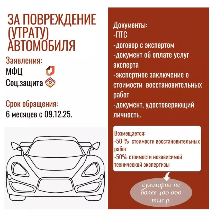 Вместе с заявлением нужно принести паспорт. Если человек получил травму, потребуется справка из больницы или поликлиники о повреждениях здоровья. Владельцам пострадавших автомобилей необходимо предоставить свидетельство о регистрации машины, заключение независимой экспертизы, договор на ее проведение и чек об оплате этой услуги. Дополнительные вопросы можно задать по телефону горячей линии Центра предоставления мер социальной поддержки: 8 (8352) 26 08 08.