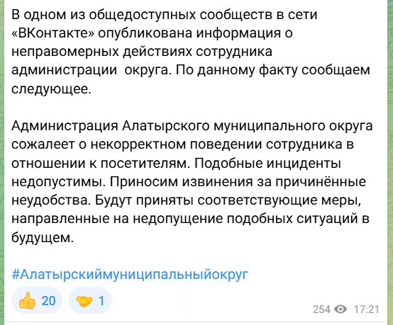 "Администрация Алатырского муниципального округа сожалеет о некорректном поведении сотрудника в отношении к посетителям. Подобные инциденты недопустимы. Приносим извинения за причиненные неудобства. Будут приняты соответствующие меры, направленные на недопущение подобных ситуаций в будущем", – сообщается в обращении.
