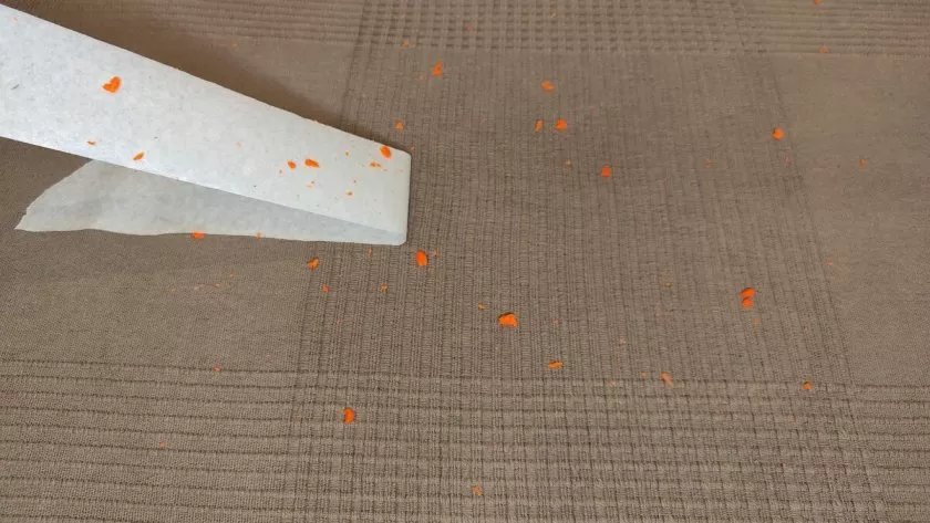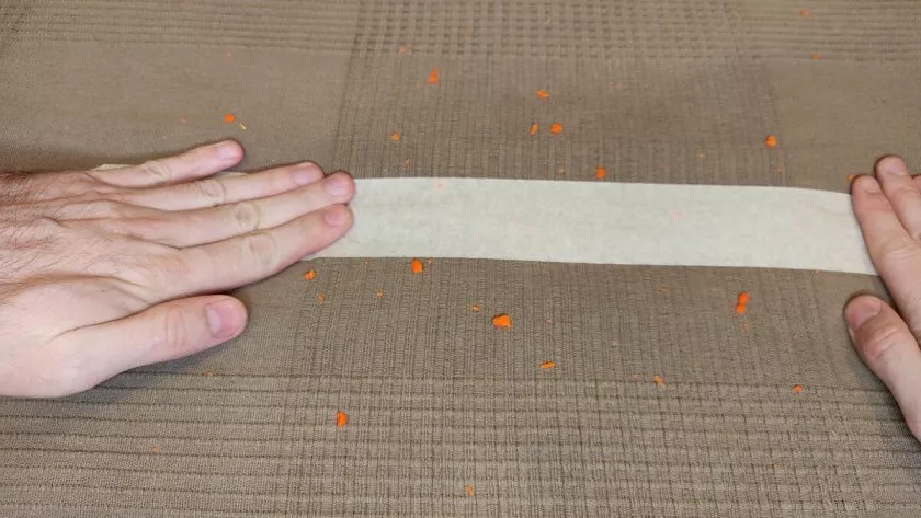 Берём малярный скотч — обычный бумажный, который легко отрывается. Отматываем кусок, прикладываем к загрязнённому месту и слегка прижимаем, чтобы лента хорошо соприкоснулась с тканью. Затем аккуратно отклеиваем — и видим, что все крошки остались на ленте.