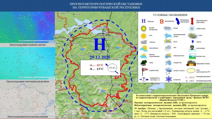 29 декабря, по данным Чувашского центра по гидрометеорологии и мониторингу окружающей среды, жителей Чувашии ожидает облачная погода, местами небольшой снег (до 1 мм). Ветер юго-восточный, от слабого до умеренного, местами туман и гололедица.