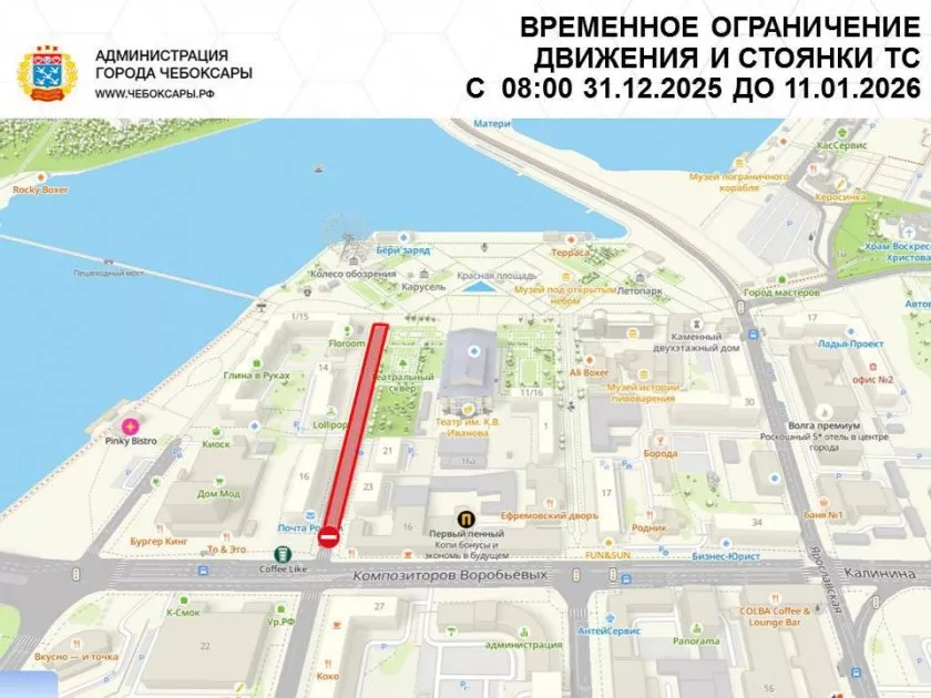 С восьми утра 31 декабря и до завершения праздничных мероприятий 1 января нельзя будет ездить и парковаться на Президентском бульваре от улицы Композиторов Воробьевых до Красной площади. Также закроют участок Ленинградской улицы на этом же отрезке и дублер проспекта Тракторостроителей от улицы 324-й Стрелковой Дивизии до торгового центра "Шупашкар".