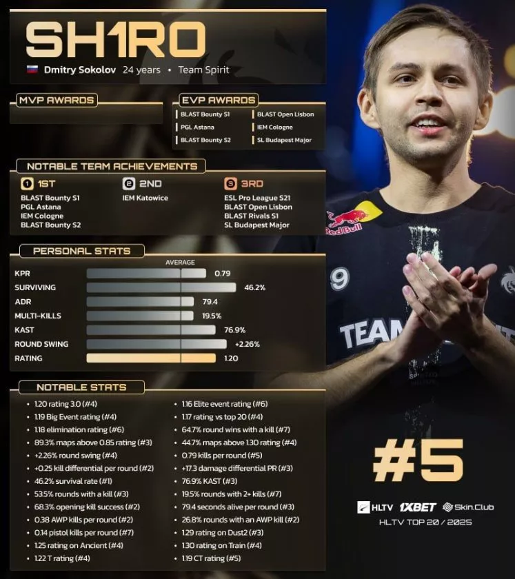 Киберспортсмен из Чебоксар Дмитрий Соколов, известный под ником sh1ro, вошел в пятерку сильнейших игроков Counter-Strike 2 за прошлый год. 24-летний спортсмен выступает за команду Team Spirit и получил пятую строчку в топ-20. Его средний рейтинг за сезон достиг отметки 1,20. Об этом сообщает championat.com со ссылкой на портал HLTV.