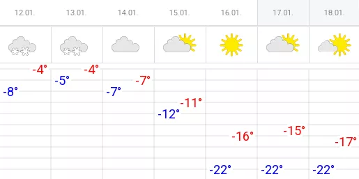 Самые холодные дни наступят во второй половине недели. Днем температура опустится до минус 10–15 градусов, ночью похолодает до минус 20–25. В выходные атмосферное давление превысит 760 миллиметров ртутного столба. Вместе с повышением давления ветер стихнет. В отдельных местах температура может опуститься до минус 30 градусов. В Чебоксарах из-за особенностей рельефа теплее будет на возвышенностях, холоднее – около водоемов и в оврагах. Синоптики ожидают, что сильные морозы сохранятся и на следующей неделе.