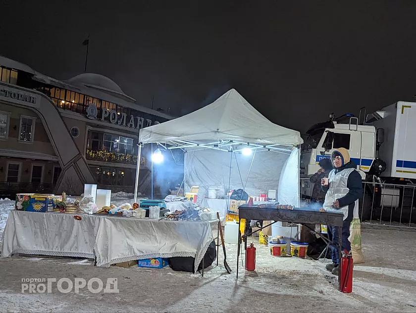 Возле купелей традиционно работали палатки с горячим чаем и едой. После купания люди подходили погреться и перекусить. Стаканчик горячего чая стоил 50 рублей, 100 граммов шашлыка — 250 рублей.