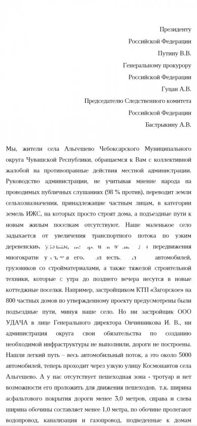 В своем обращении жители Альгешево подчеркивают, что уже неоднократно обращались в администрацию округа и правительство республики с просьбой построить объездные пути, но, по их словам, реакции на эти обращения нет. Они просят провести проверку обоснованности перевода сельхозземель под ИЖС без одновременного развития инфраструктуры, необходимой для безопасной и комфортной жизни. Свое обращение жители Альгешево составили в адрес президента страны Владимира Путина, генерального прокурора Александра Гуцана и руководителя следственного комитета России Александра Бастрыкина.