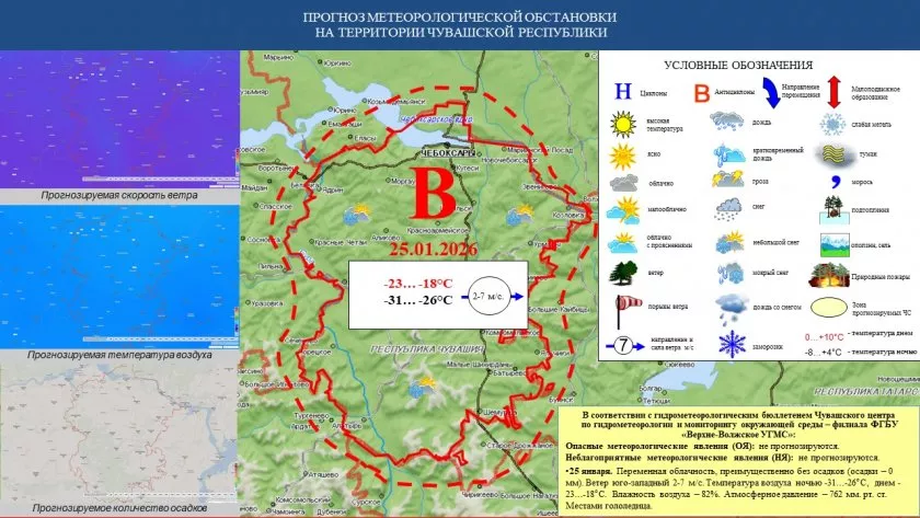 25 января, по данным Чувашского центра по гидрометеорологии и мониторингу окружающей среды, жителей Чувашии ожидает переменная облачность, преимущественно без осадков (0 мм). Ветер юго-западный, от слабого до умеренного, местами гололедица.