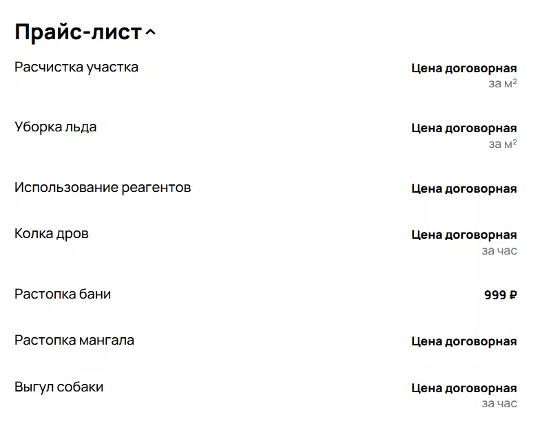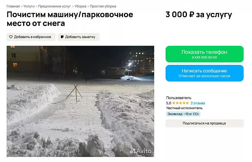 Некоторые исполнители указывают точную стоимость работ — например, от 40 рублей за квадратный метр. В ряде объявлений услуги не ограничиваются только уборкой снега. Так, один из авторов предлагает целый набор бытовой помощи: от откопки машины и очистки льда до выгула собак, колки дров, растопки бани или мангала. Попутно можно заказать и “прикуривание” автомобиля — в среднем за 900 рублей.