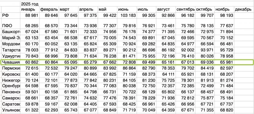 Если сравнивать с соседними регионами, то в Чувашии самый маленький показатель по зарплате за этот период. Самая высокая средняя зарплата в ноябре зафиксирована в Татарстане – почти 95 729 рублей. Однако в целом в 2025 году в Чувашии показатель не опускался ниже 60 тысяч рублей.