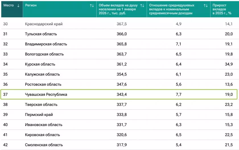 В Чувашии же объем вкладов на одного жителя составил 343 400 рублей. Прирост вкладов в 2025 году в регионе составил 19 %. Для сравнения, один из ближайших соседей, Татарстан, разместился на 26-м месте. Там объем вкладов на одного жителя 386 300 рублей.
