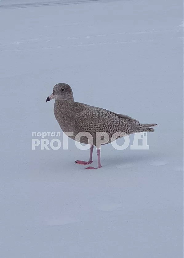 Встреча произошла на зимней рыбалке в Заволжье. Наш читатель Владимир заприметил непривычную для наших мест птицу – крупную пеструю чайку.