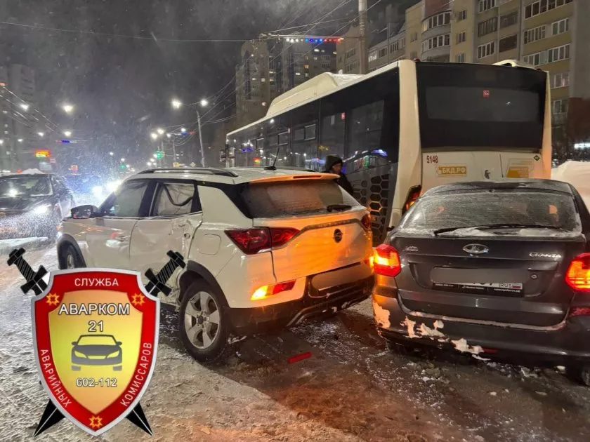 В Чебоксарах на Максима Горького произошло крупное ДТП с участием нескольких легковых авто и автобуса