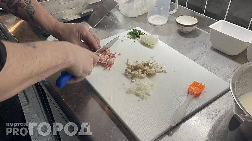 "Это просто профессиональная фишка: смешиваем растительное масло и мелко нарубленный либо прокрученный чеснок, получается чесночное масло. Так как наши блины с беконом и грибами, такое масло раскроет их вкус. Мажем тонким слоем – и готово", – поделился тонкостями приготовления Евгений.