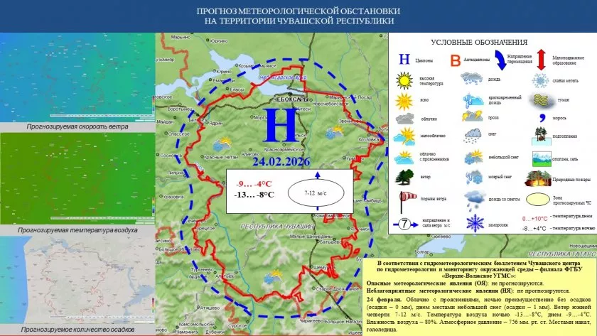 24 февраля, по данным Чувашского центра по гидрометеорологии и мониторингу окружающей среды, жителей Чувашии ожидает облачная с прояснениями погода, ночью преимущественно без осадков, днем местами небольшой снег (до 1 мм). Ветер южной четверти, сильный. Местами накат, гололедица.
