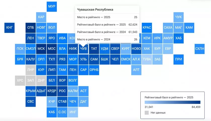 Чувашия в этом рейтинге поднялась на одну строчку вверх – с 26-го места в 2024 году на 25-е в 2025-м среди 85 регионов. Небольшой, но уверенный сдвиг вперед на фоне конкурентов.