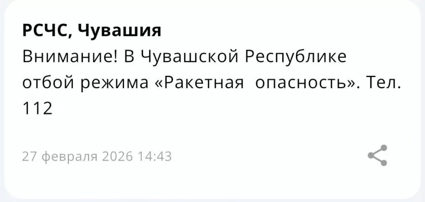 Напомним, что оповещение для жителей Чувашии о ракетной опасности вышло в 12:25. Ранее "Про Город" сообщал, что, по данным оперативных служб, две ракеты пытались нанести атаку на республику.