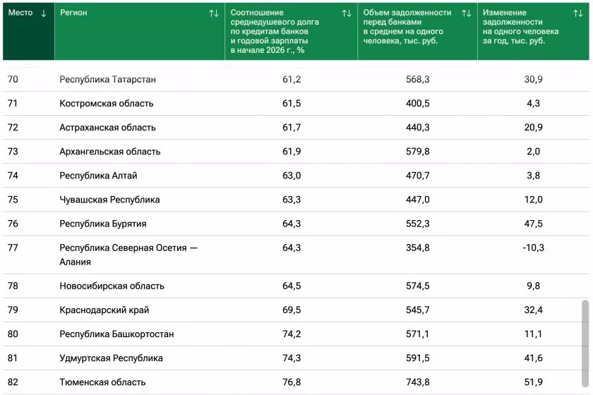 Всего в рейтинге 85 мест. Чувашия расположилась в нем на 75-м месте. Объем задолженности перед банками в среднем на одного человека в республике составляет 447 тысяч рублей. А соотношение задолженности к годовой зарплате – 63,3 %. За год прирост задолженности в среднем на одного жителя региона достиг 12 тысяч рублей.