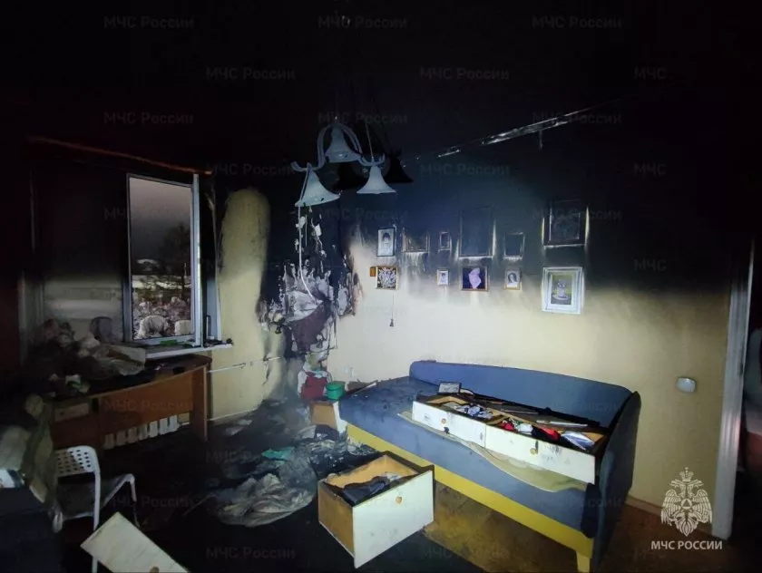 Спасатели ликвидировали возгорание на двух квадратах. Сгорели телевизор и тумба. Пламя повредило внутреннюю отделку комнаты. По предварительной версии, причиной ЧП стал аварийный режим работы электрооборудования.