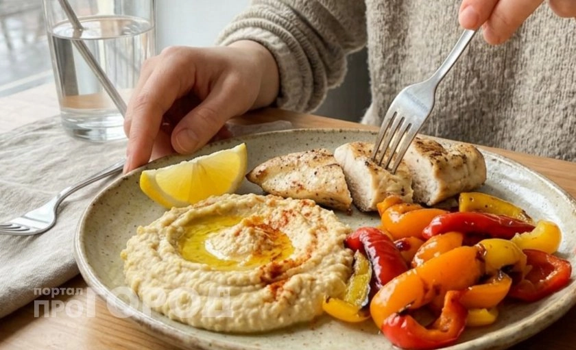 Второй способ — запеченное куриное филе с овощами и хумусом. Это вариант для тех, кто устал от сухой грудки: в этом рецепте она остается сочной за счет слоя хумуса и овощей. На противень выкладываете ломтики цукини, кабачка и лука, сверху — подсушенные бумажным полотенцем куски куриной грудки, щедро смазываете хумусом. Сбрызгиваете все лимонным соком, посыпаете паприкой или смесью специй для курицы и отправляете в духовку на 25–30 минут. Хумус при запекании превращается в плотный, кремовый слой, который защищает мясо от пересушивания и дает легкий ореховый привкус. В итоге вы получаете полноценное блюдо «два в одном» — и курицу, и теплый овощной гарнир, который хорошо заходит даже тем, кто обычно грудку не любит.