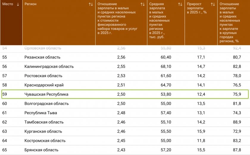 Всего в рейтинге 82 позиции. Чувашия заняла 59-ю строчку. Средней зарплаты в чувашской провинции хватает, чтобы приобрести 2,50 фиксированного набора товаров и услуг. Средняя зарплата за 2025 год оказалась почти 54 тысячи рублей в месяц. Рост зарплаты за год составил 12,4 %.