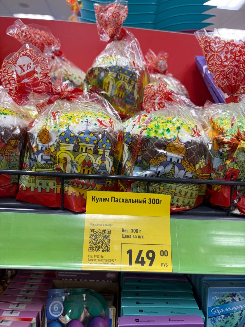 Для начала стоит определиться с основой пасхнего стола. В Fix Price уже продают куличи весом 300 г по цене 149 рублей — это вариант «на сейчас», если печь некогда.