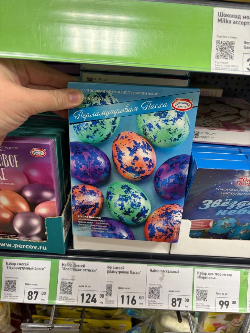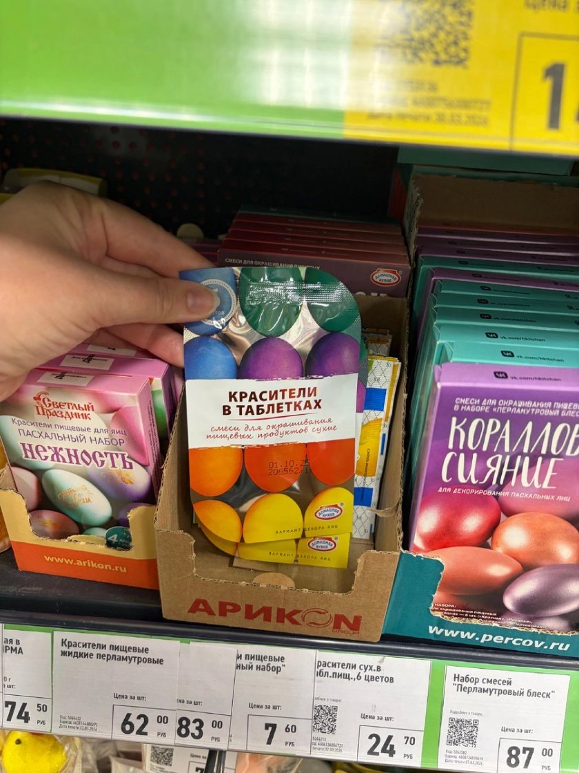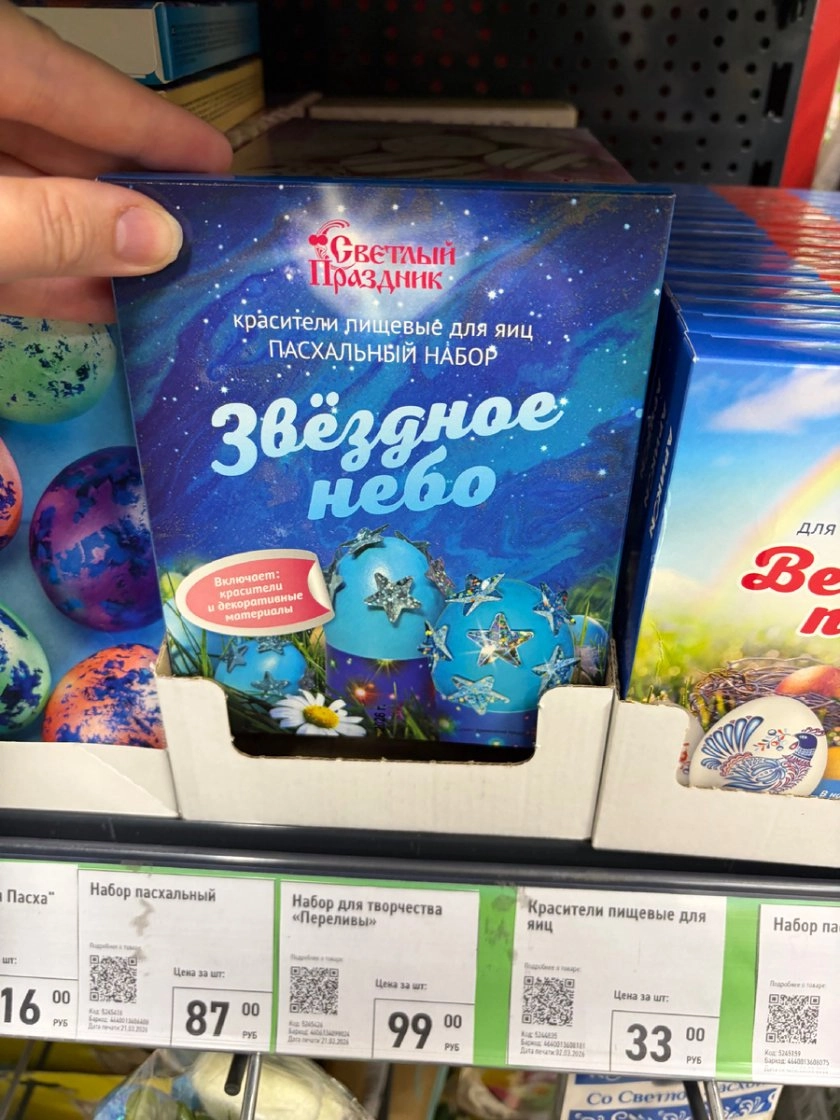 Для любителей глубоких космических оттенков есть пищевые красители «Звёздное небо» за 87 рублей, а самый экономичный вариант — набор из 6 таблеток‑красителей всего за 24,7 рубля: подходит, если нужно быстро окрасить много яиц без лишних затрат.