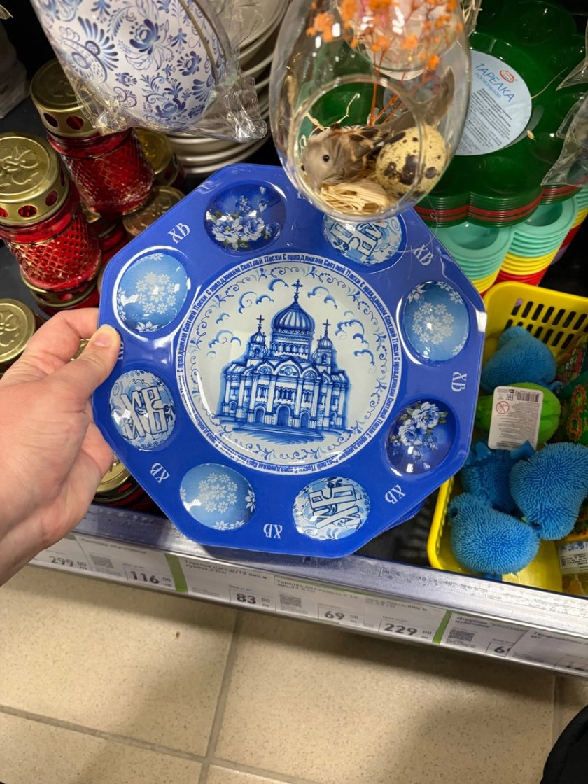 Чтобы красиво подать уже готовые яйца и кулич, можно присмотреть специальную посуду. Стеклянная тарелка для восьми яиц и одного кулича диаметром 23,5 см стоит 229 рублей и сразу создаёт ощущение «полного пасхального набора» на столе.