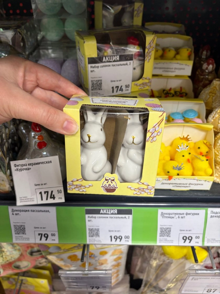 Дополнительно атмосферу поддержат пасхальные солонки в виде зайчиков — набор из двух штук обойдётся в 199 рублей и будет уместен и в праздник, и после него, как милый акцент на кухне.