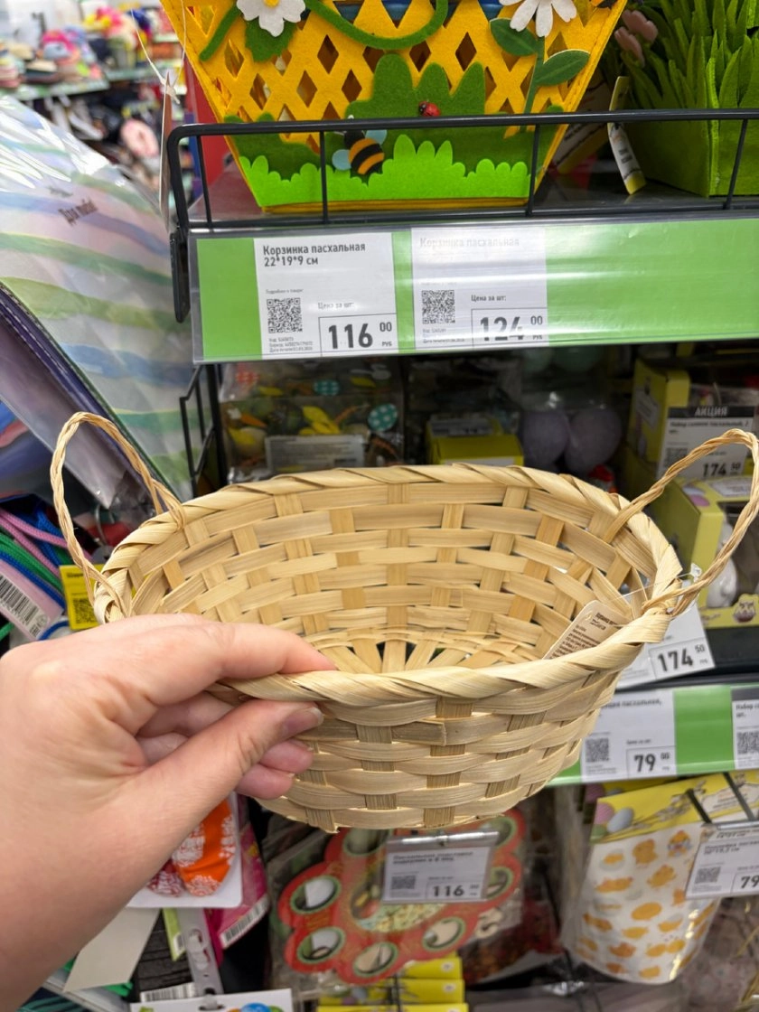 Fix Price не забыл и про декор для дома и традиционные корзинки для освящения. Плетёная бамбуковая корзинка размером 22×19×9 см за 116 рублей подойдёт и для похода в храм, и для сервировки дома.