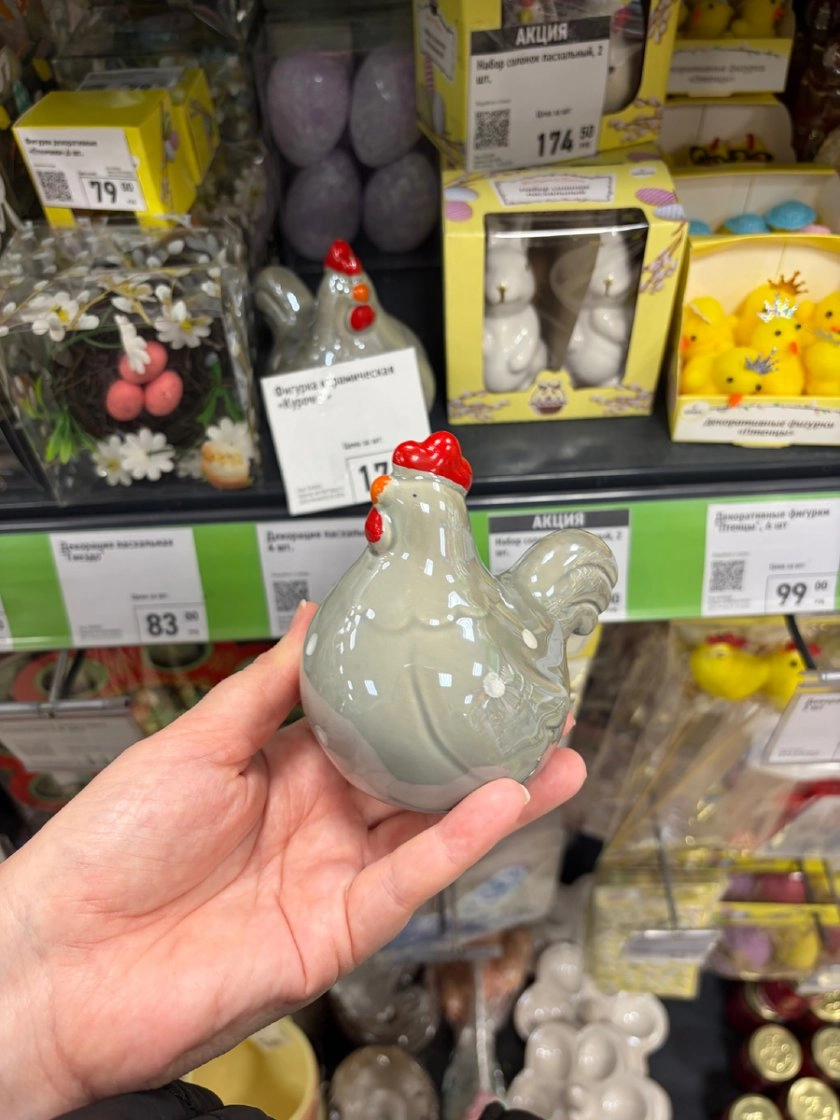 Отдельного внимания заслуживают декоративные мелочи, которые создают настроение. Керамическая фигурка «Курочка» за 174,5 рубля станет уютным акцентом на кухонной полке или в центре праздничной композиции с яйцами и свечами.