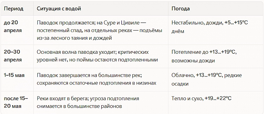 Так когда же ситуация с паводками станет легче? Примерно представить это можно, опираясь на прогноз погоды. Синоптики еще в начале марта предупреждали, что апрель 2026 года будет холоднее нормы, зато довольно дождливым. Прогнозы по Чебоксарам на апрель подтверждают нестабильность: чередование дней с температурой +10…+17 °C и отдельных возвратов до +2…+3 °C. Влажность в первой половине апреля – 80–100 %, частые дожди. Таким образом, апрель не дает и скорее всего не даст рекам передышку. Дожди на фоне продолжающегося таяния лесного снега будут поддерживать уровни воды на высоких отметках до конца месяца. Отдельные подтопления садовых товариществ и низменных участков возможны вплоть до конца апреля.