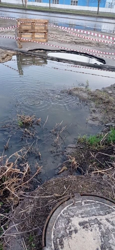 В этом районе в очередной раз прорвало канализационные трубы, и теперь из земли здесь бьет вода с запахом фекалий, которая растекается по улице и подмывает тротуары.
