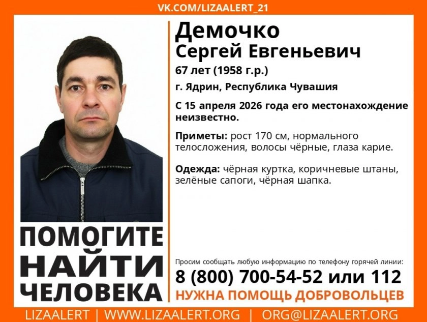 Сергей Демочко 1958 года рождения пропал 15 апреля 2026 года. Уже семь дней о его местонахождении ничего не известно.
